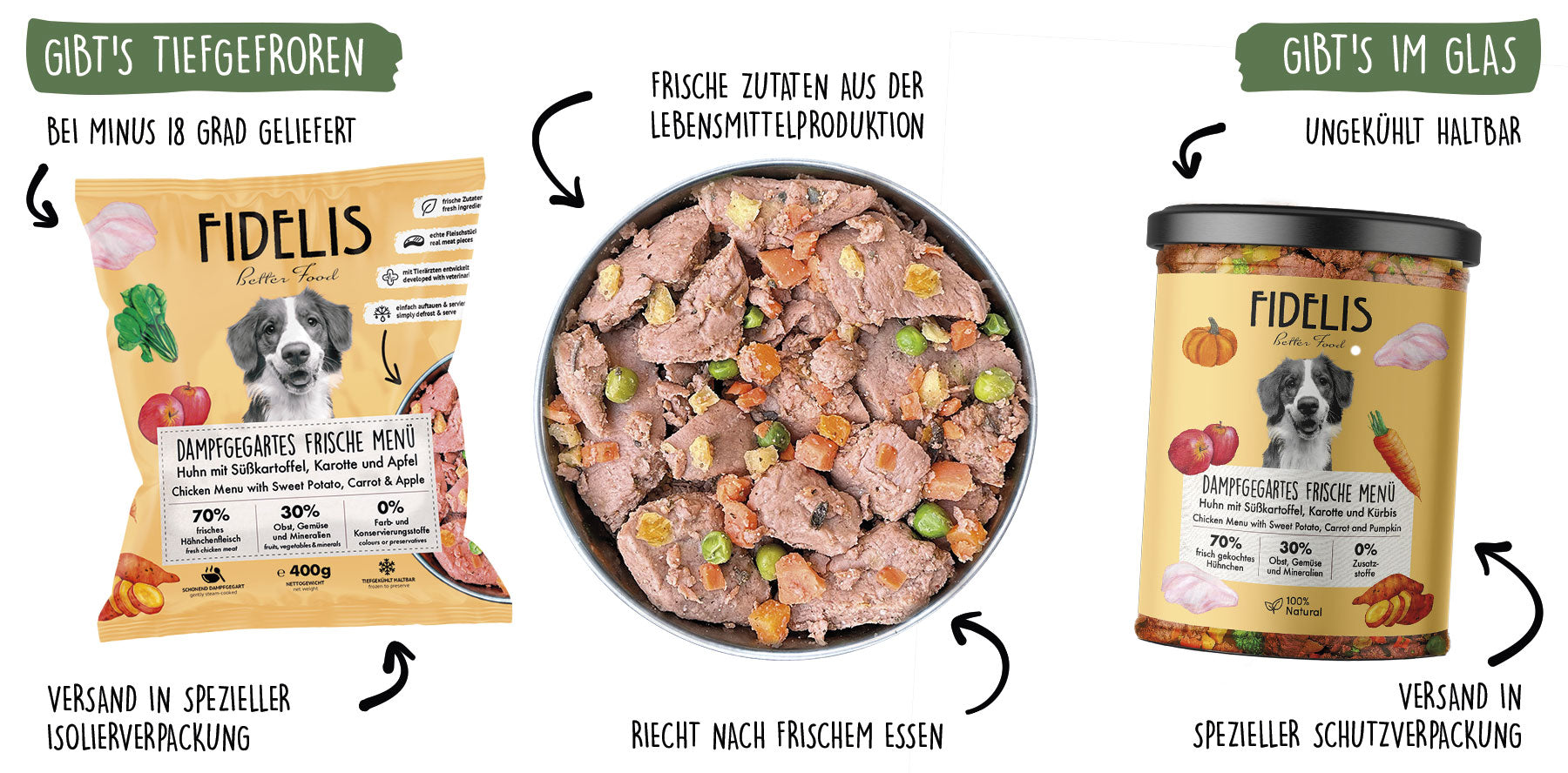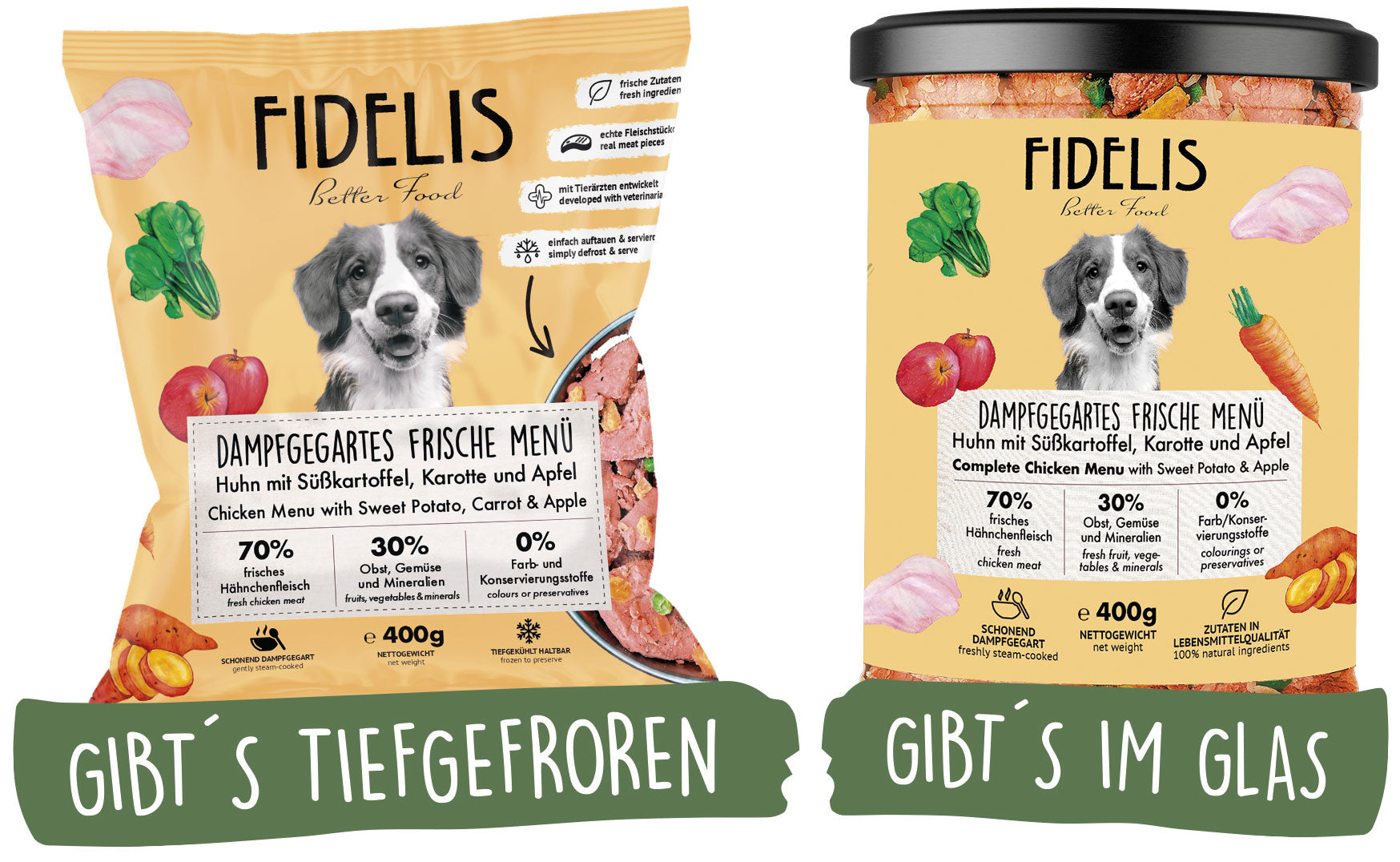 FIDELIS hat sich auf die Produktion von schonend dampfgegarten Hundefutter spezialisiert. Das FIDELIS Frische Menü hat innerhalb kürzester Zeit viele Kunden gefunden, die auf der Suche nach einem sehr gut verdaulichen und hochwertigem Hundefutter waren. Das Futter ist deswegen vor allem für Hunde mit Verdauungsproblemen oder für mäkelige Esser geeignet.